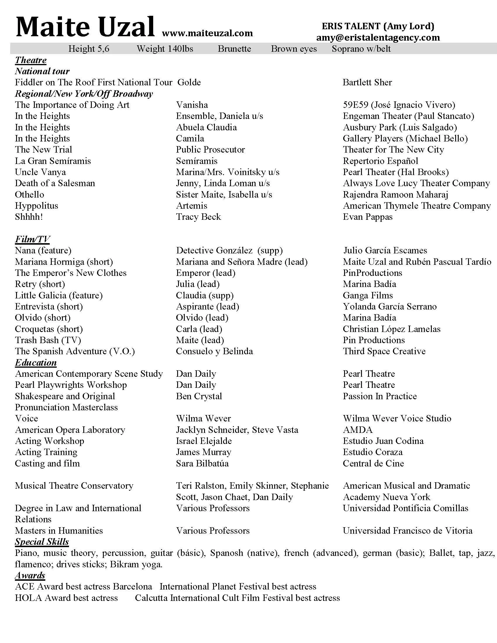 Maite is a Spanish actress and singer from Madrid, Spain. She graduated from the Musical Theatre Conservatory Program at the American Musical and Dramatic Academy (NYC). Before that, she was a litigator in her native country where she also appeared in productions of “Les Miz” (Fantine) and “Martin Guerre” (Bertrande). NYC credits include “In the Heights”, “Death of a Salesman” and “Uncle Vanya”. Highlights in film include the feature, “Little Galicia” as well as the award winning short “Olvido”. She has originated the role of Semíramis at Repertorio Español, for which she earned a Latin ACE Award and an HOLA Award. She has collaborated on several occasions with The Living Theater. Most recently she has originated the character Maite for the bilingual children’s TV show “Trash Bash”, where she also co-produces and composes, and she can be seen as Golde in the 1st North American National Tour of “Fiddler on the Roof” directed by Bartlett Sher.